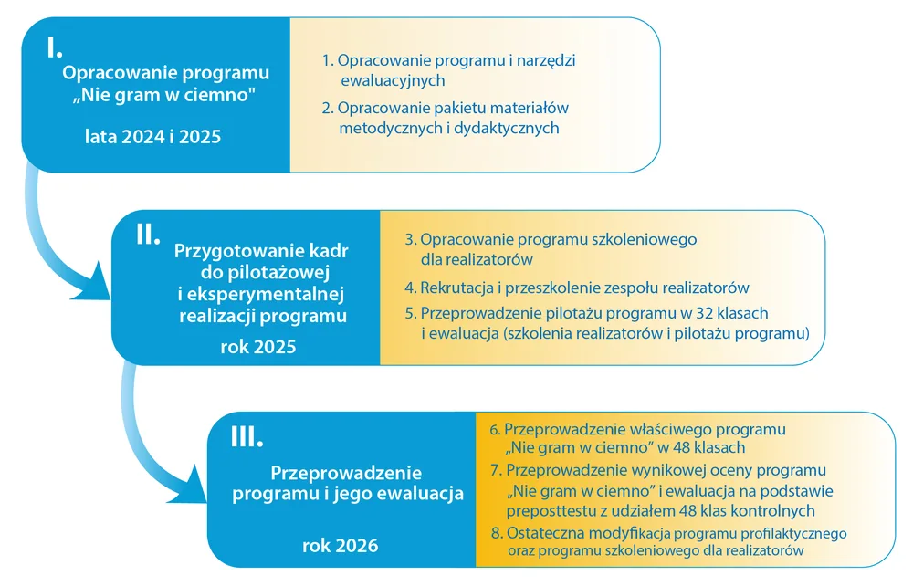 - Przeprowadzenie pilotażu programu Nie gram w ciemno i jego końcowa ewaluacja (realizacja: rok 2026)